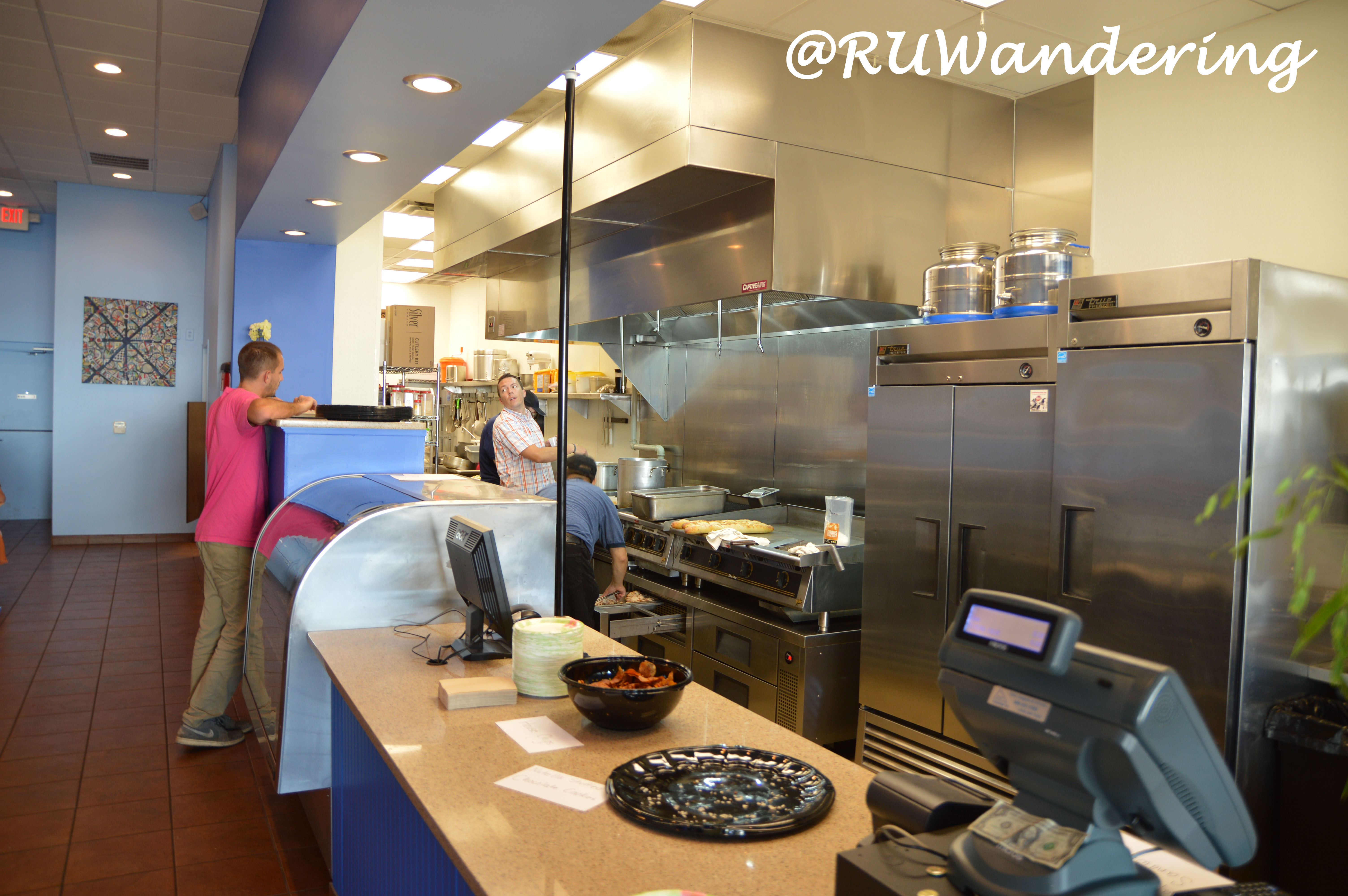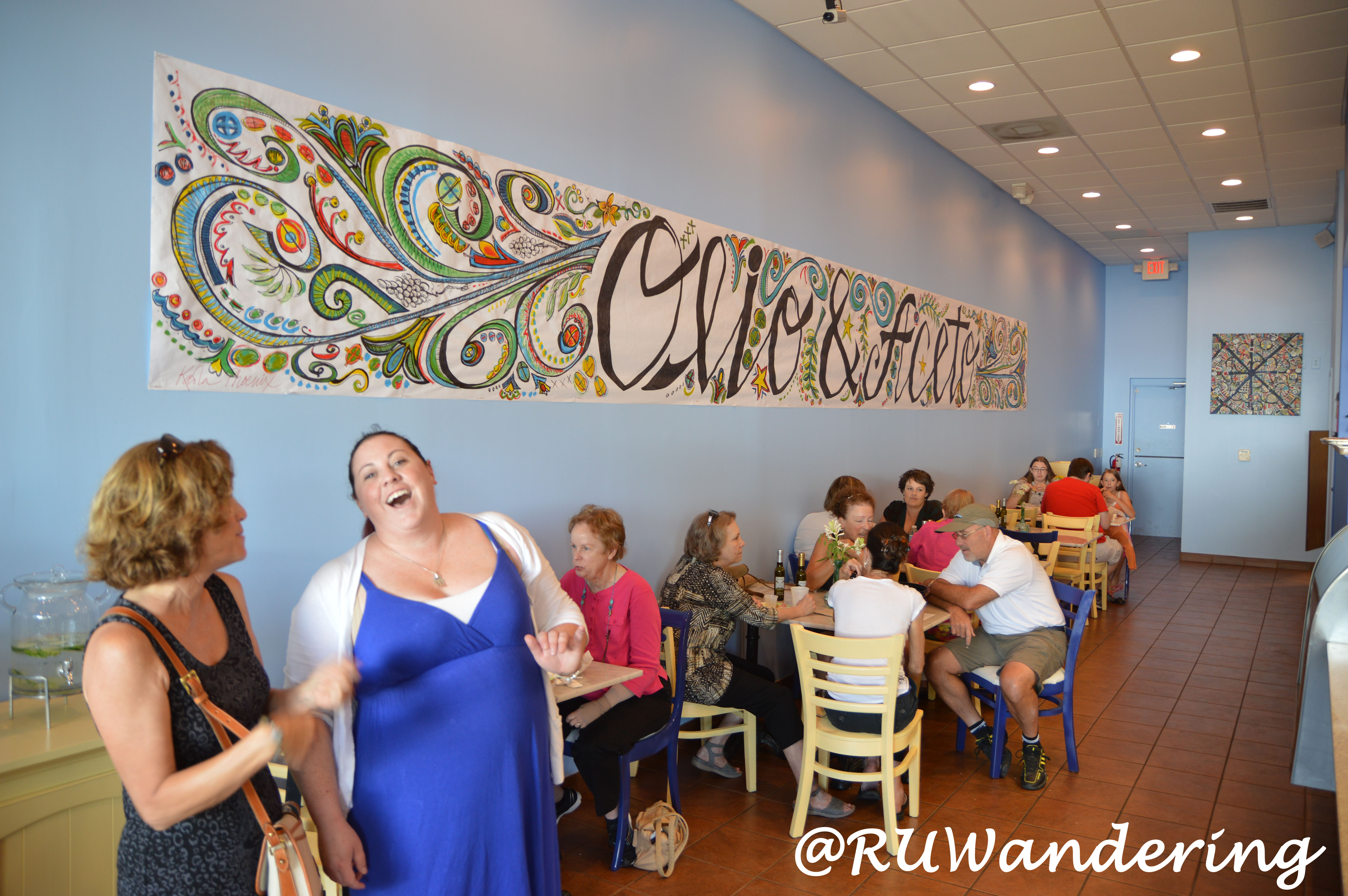 I have to admit so biased, because I love the girls behind Olio and Aceto and the color blue, but the inside looks awesome. In addition to the name and the key ingredients, the name’s wall mural gives a southern Mediterranean feel to it. As far as size, for a cafe there is plenty of seating with a few spots outside for that sidewalk cafe feel. The kitchen area is pretty open, so you can peer inside to see what’s cooking.